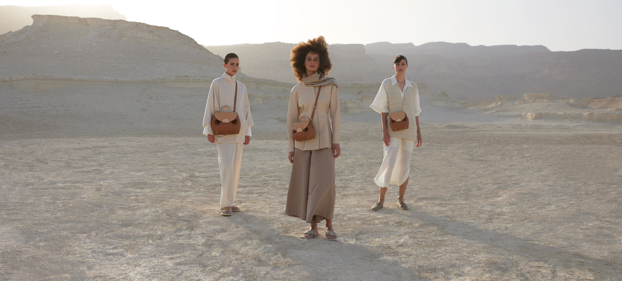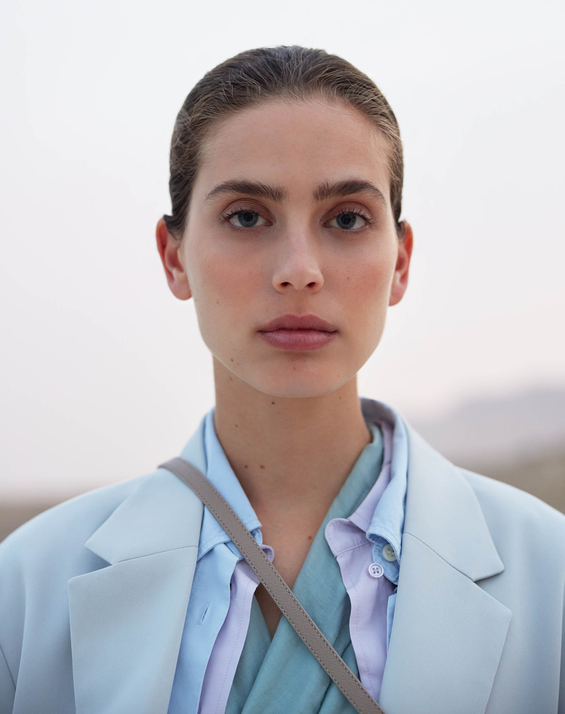 The minimalist landscapes of the salty sea. The Dead Sea is the perfect backdrop to showcase Polène’s leather goods collection. A location chosen for its duality—both minimalist and plural. Sleek, a superposition of plane lines, yet versatile when the sky’s colors are reflected in the water and changing salt beds.