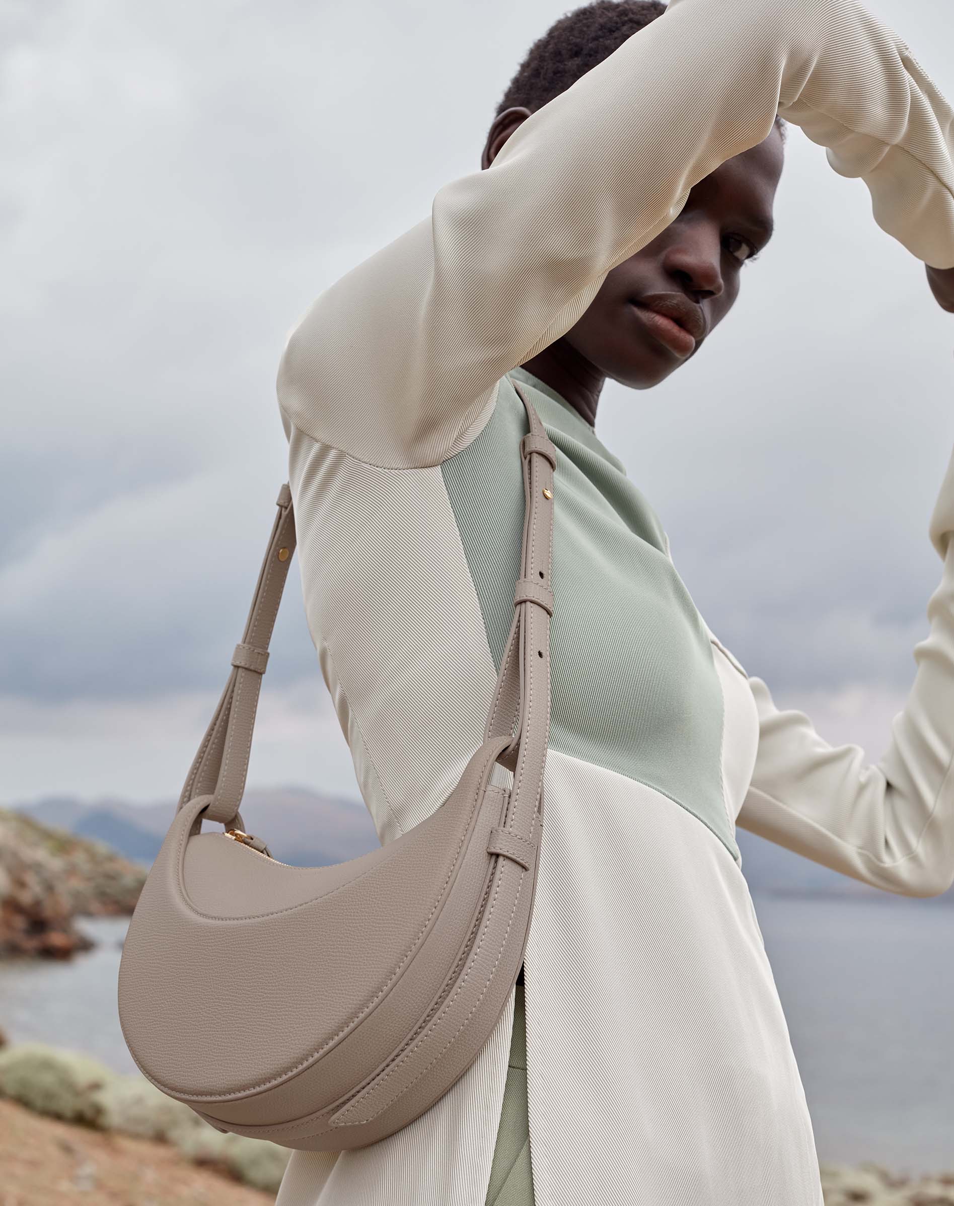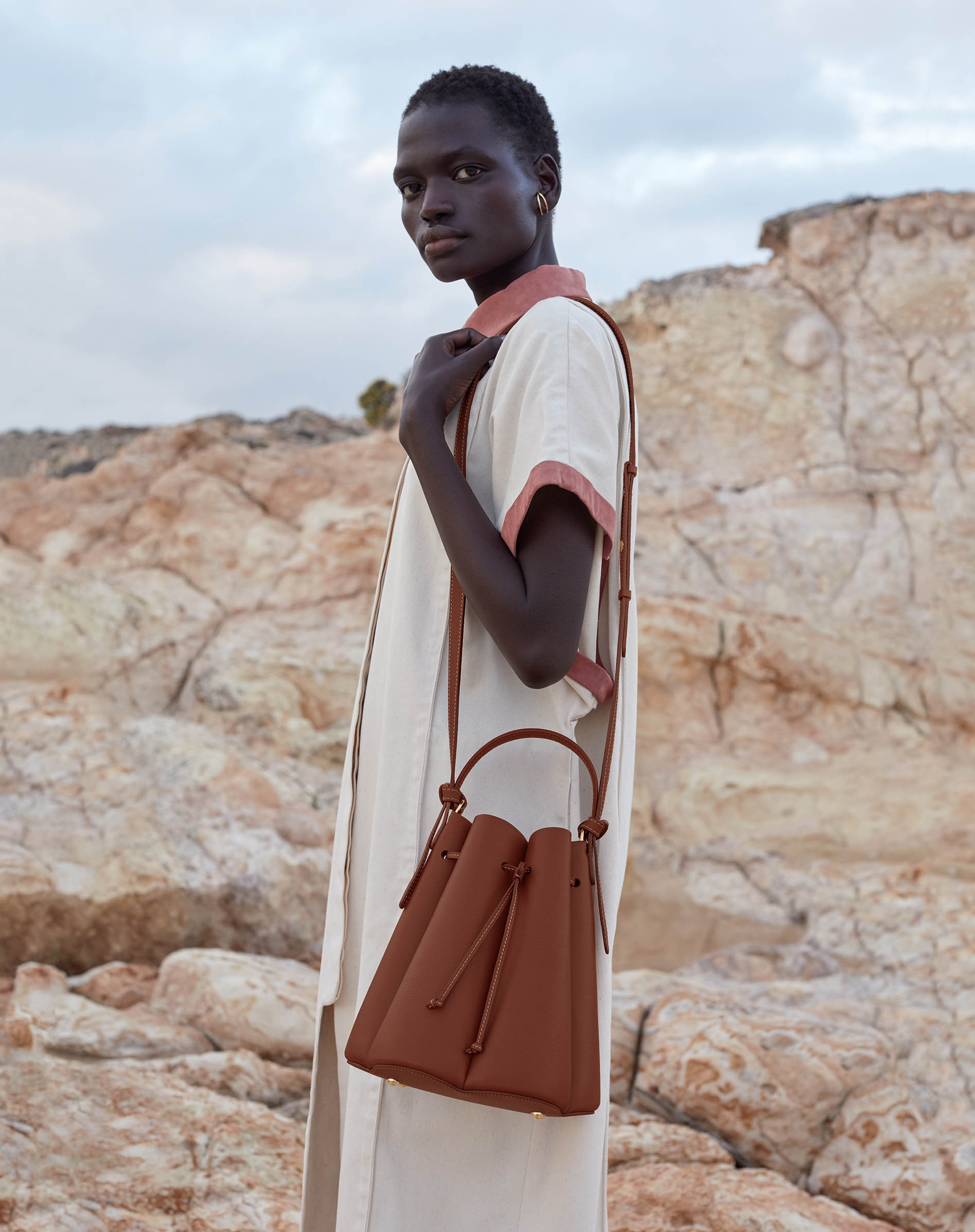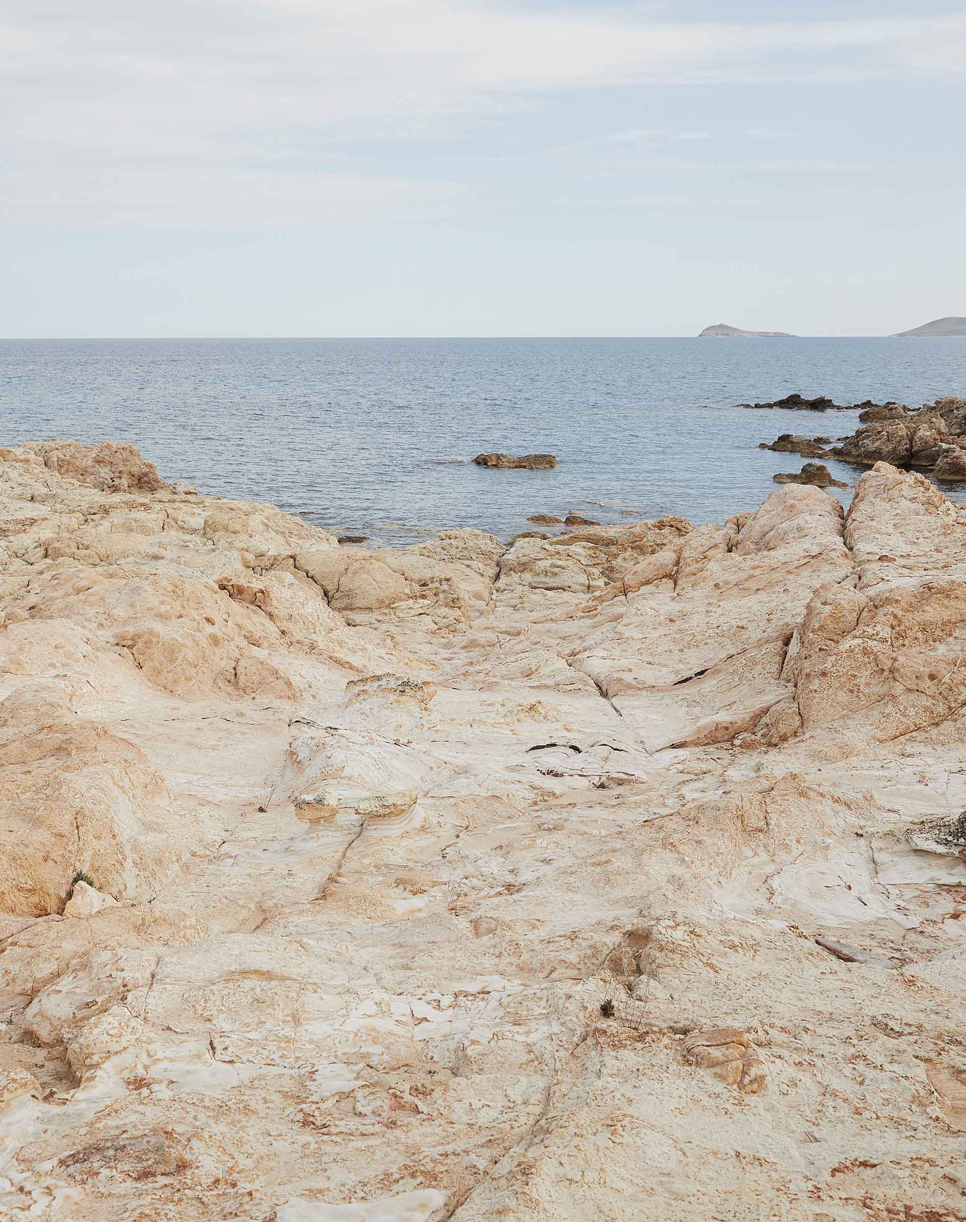 A sunny, stony island with pinkish beige rocks that reflect Polène’s preferred color palette. Its organic flowerbeds and reliefs draw attention to the sculptural qualities of the pieces in the collection.