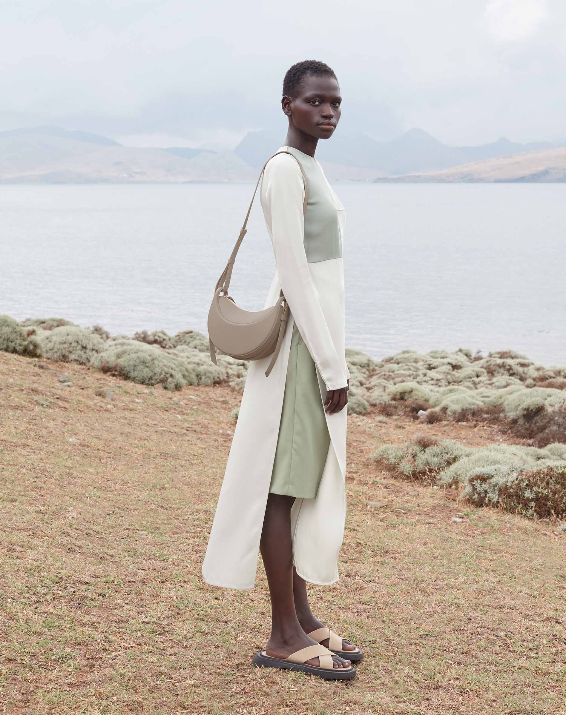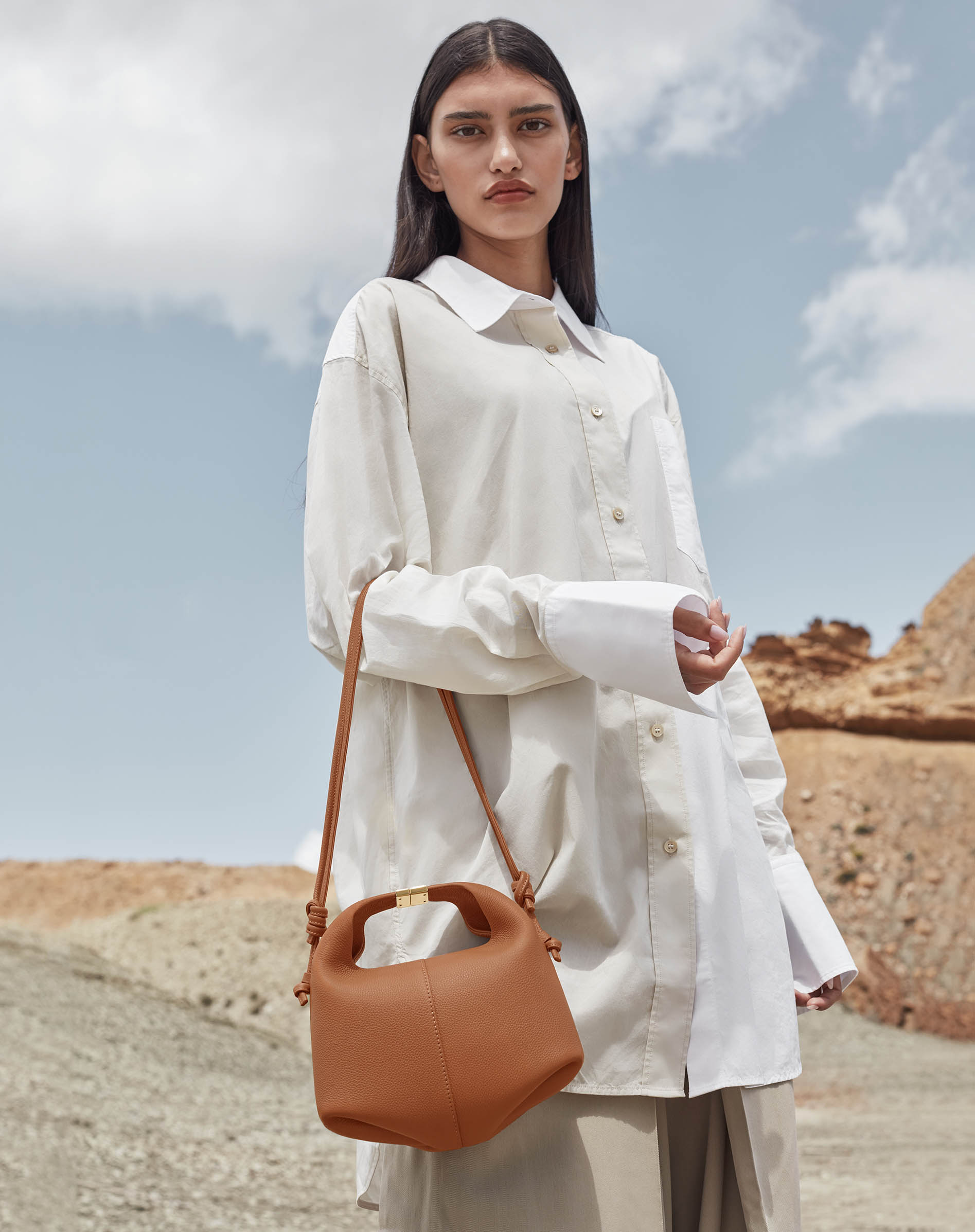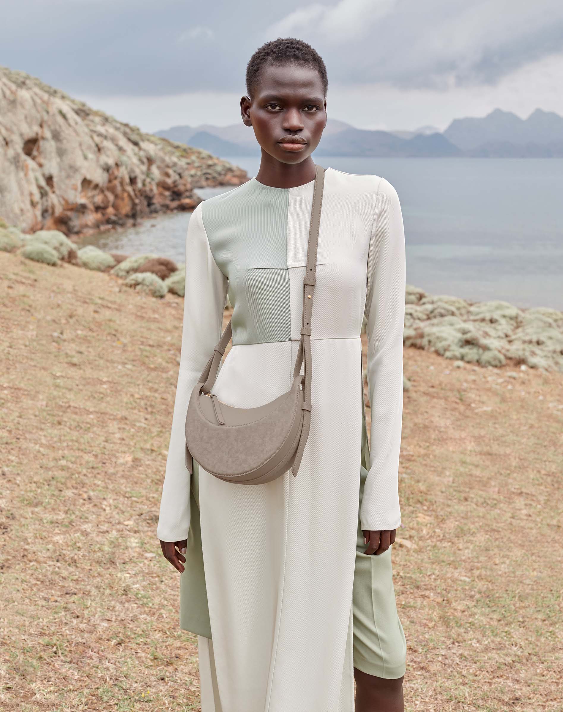 A sunny, stony island with pinkish beige rocks that reflect Polène’s preferred color palette. Its organic flowerbeds and reliefs draw attention to the sculptural qualities of the pieces in the collection.