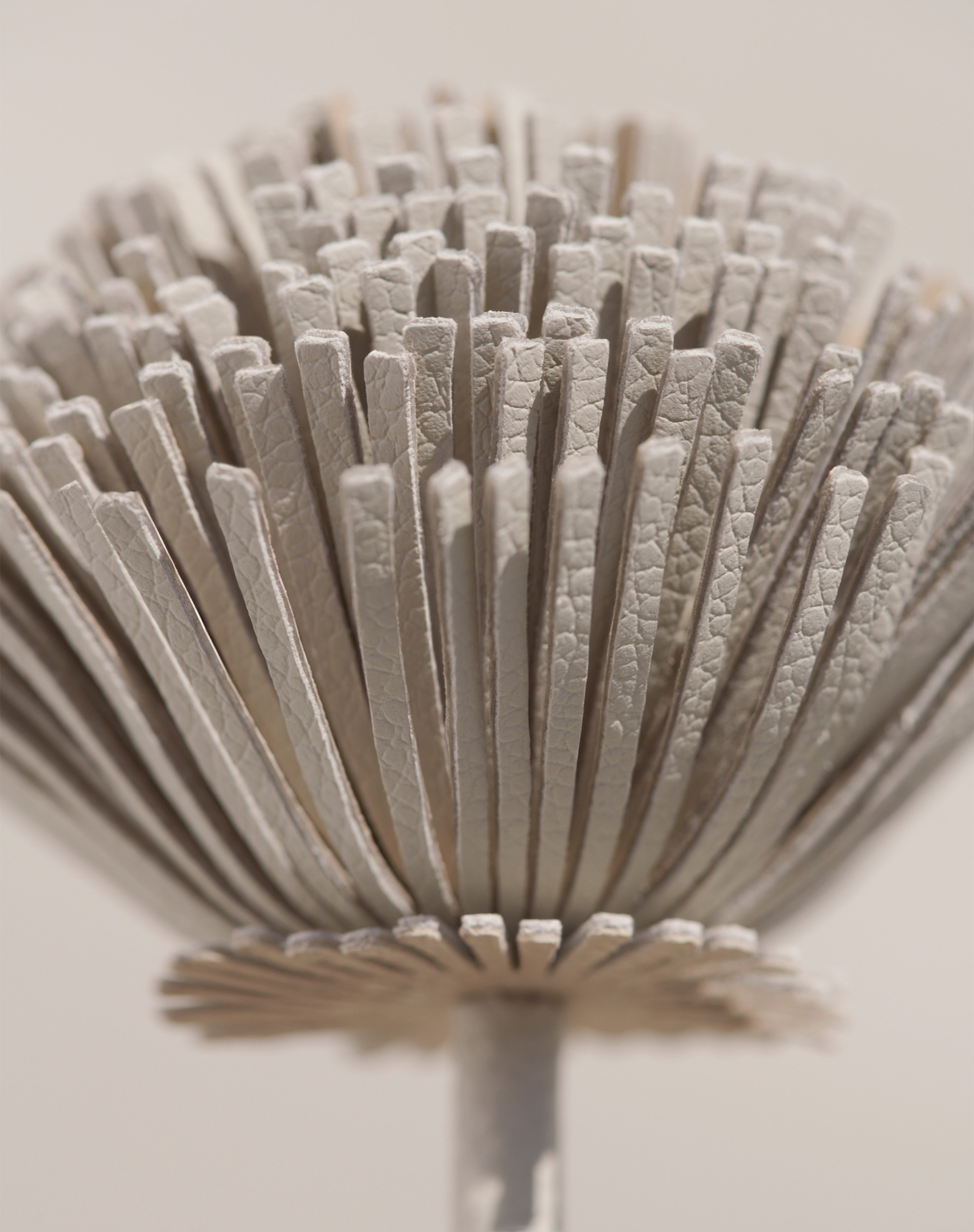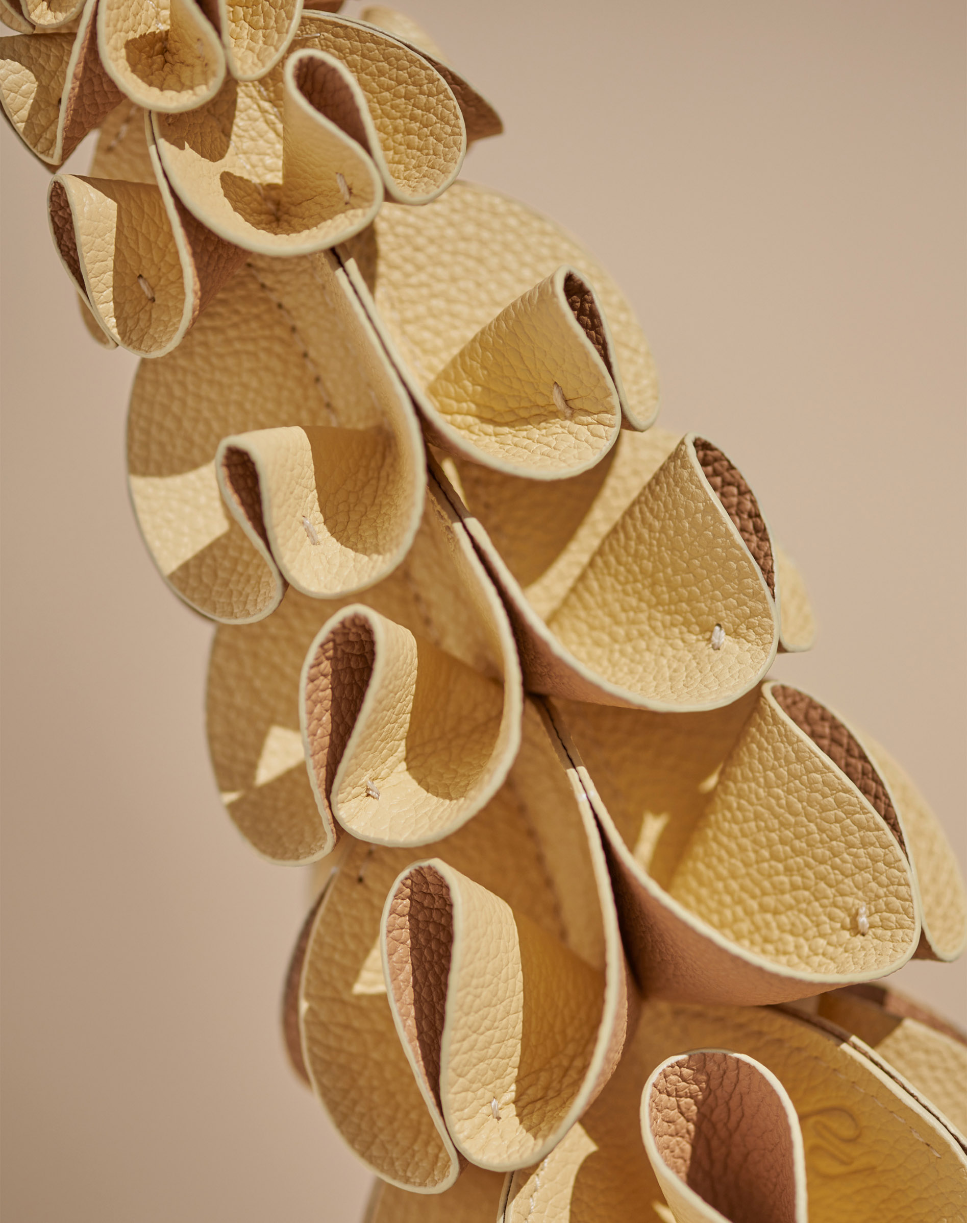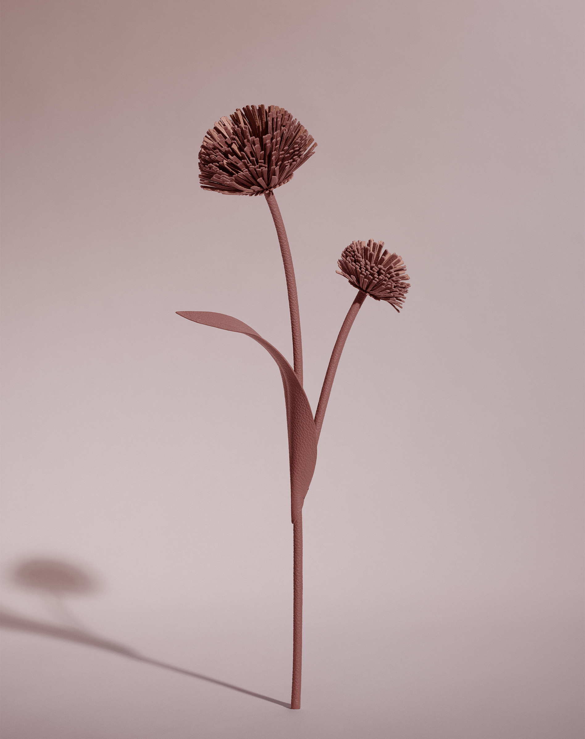 Handcrafted by artisans in Ubrique, Spain, the flowers combine two or three leather off-cuts. Their leather-covered stems are adorned with ribbed leaves. Hand-stitching produces intricate folds that delicately replicate the elegant shapes of petals and leaves. Each creation is finished with dyed edges.