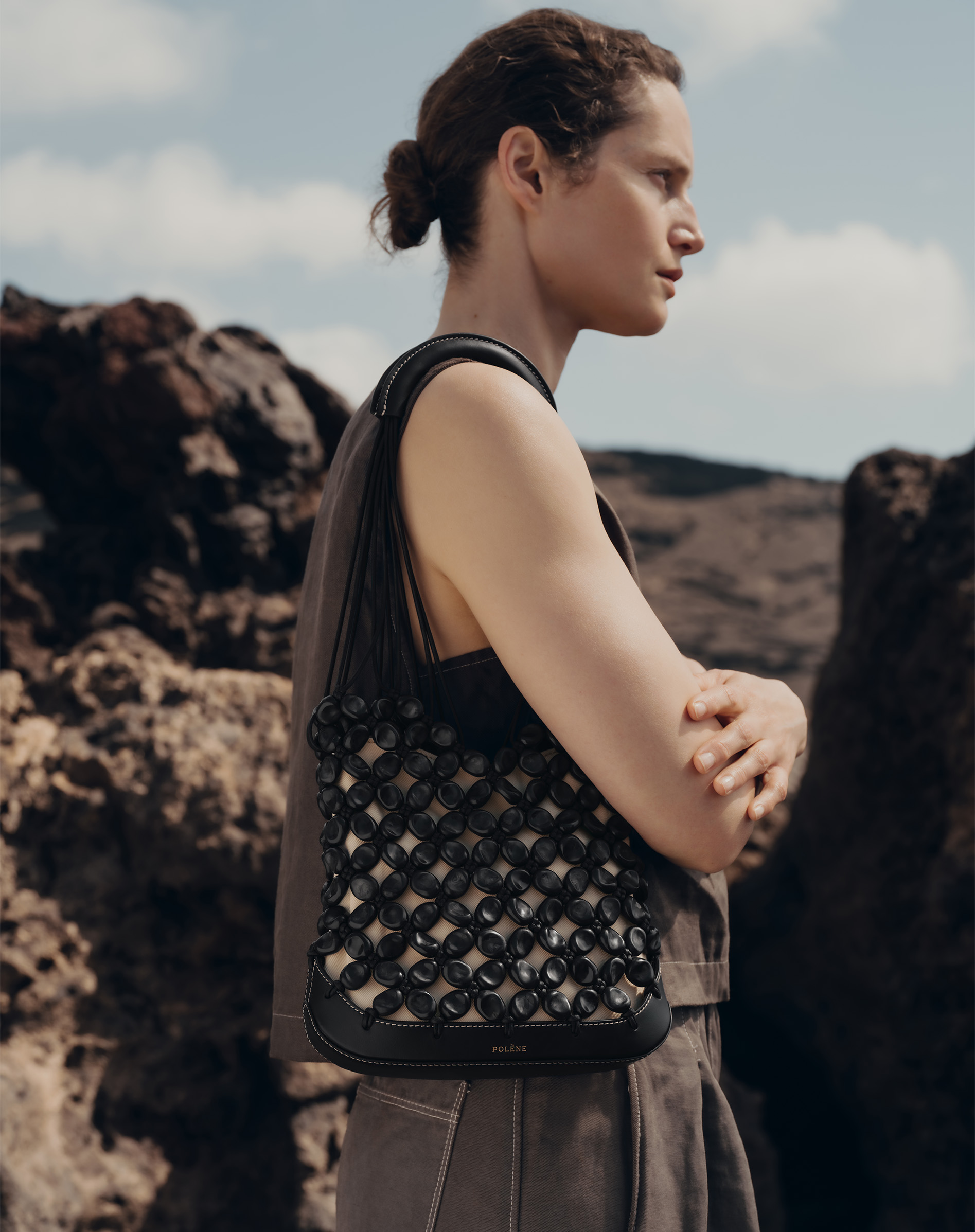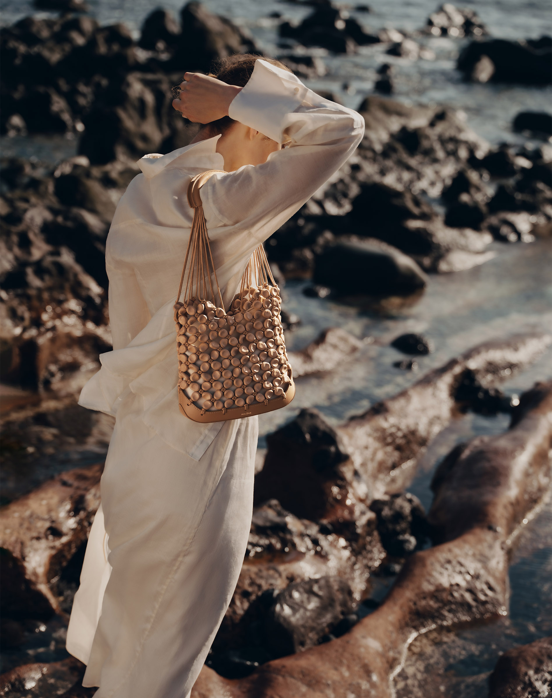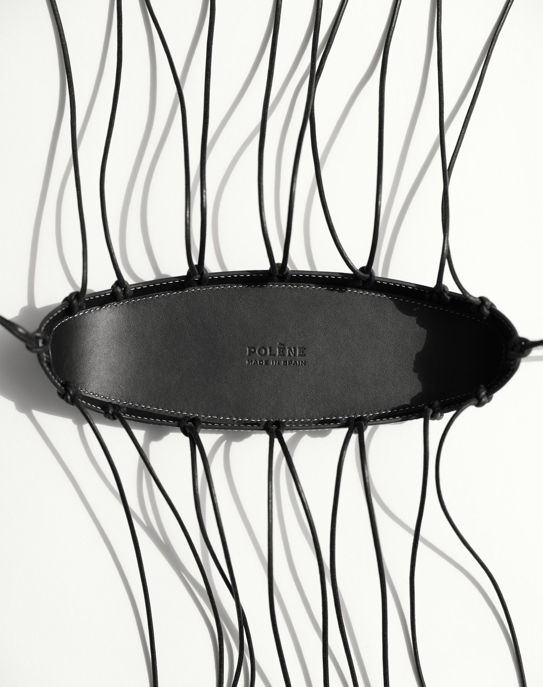 “Solé” celebrates the meticulous artisanship of macramé. Threaded onto waxed cotton cording, the 240 leather pearls create a mesh with 120 handmade knots. The bag’s base and handle are covered with stitched smooth leather, reflecting the leather goods expertise of artisans in Ubrique, Spain.