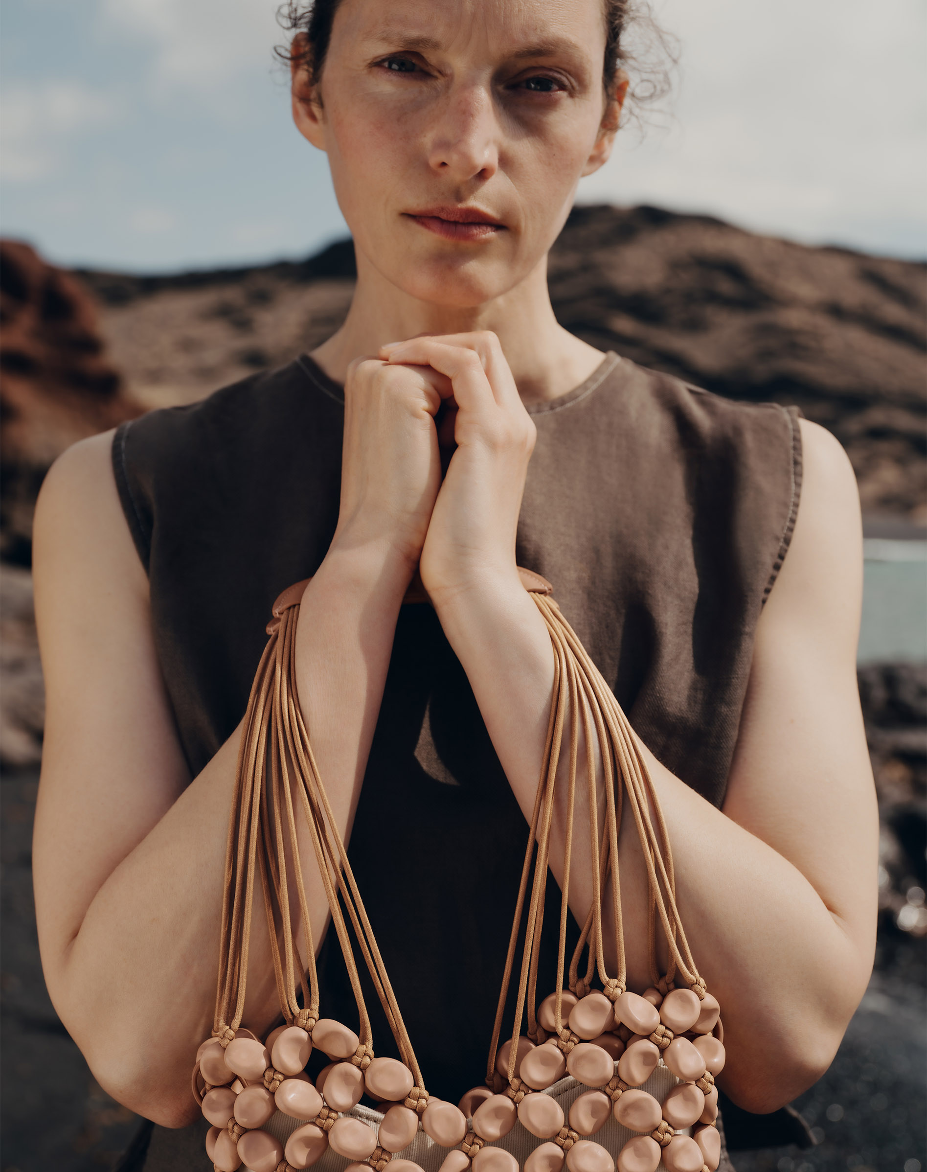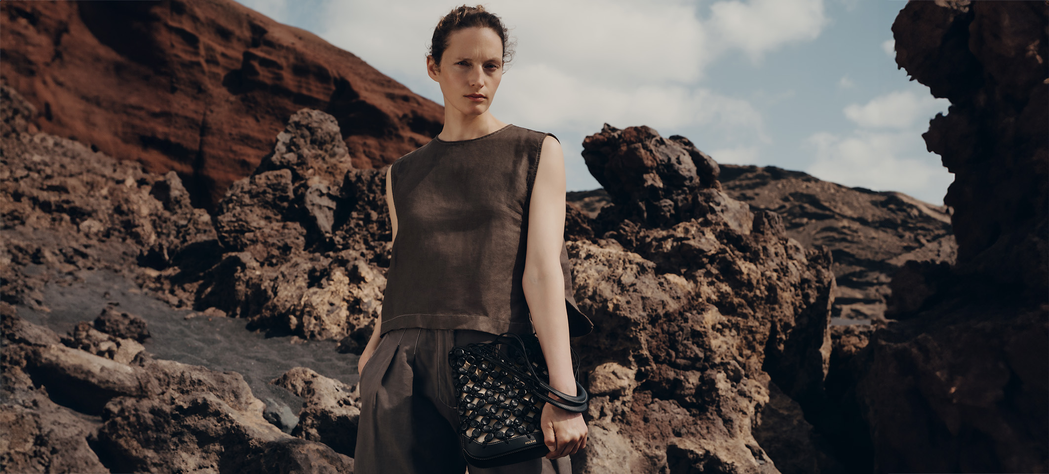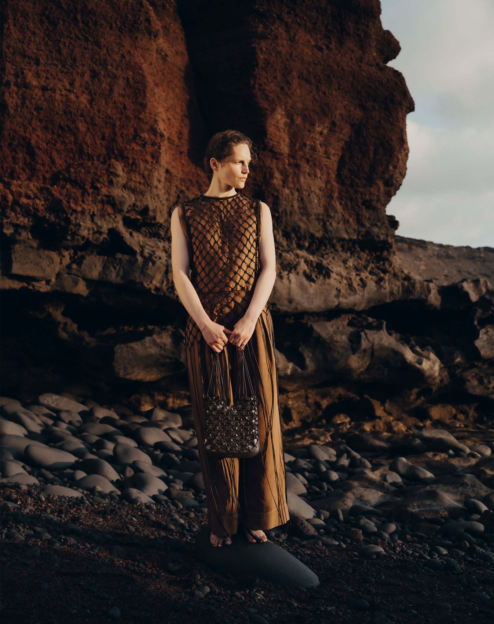 “Solé” celebrates the meticulous artisanship of macramé. Threaded onto waxed cotton cording, the 240 leather pearls create a mesh with 120 handmade knots. The bag’s base and handle are covered with stitched smooth leather, reflecting the leather goods expertise of artisans in Ubrique, Spain.