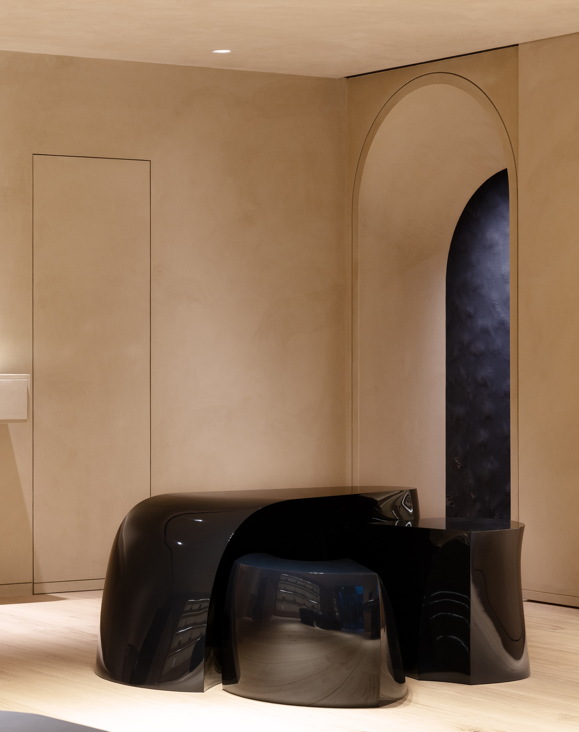 Polène’s commitment to savoir-faire is emphasized in the ancestral Japanese technique of Urushi lacquer. Meticulously applied by hand, this technique gives a smooth, glossy appearance to all the furniture, which take the shape of deep blue stones. A special hue developed for the custom-made leather seats.